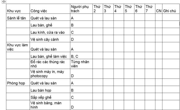 - Lập bảng chi tiết và rõ ràng: Liệt kê đầy đủ các công việc, khu vực, người phụ trách, tần suất và ghi chú cần thiết.